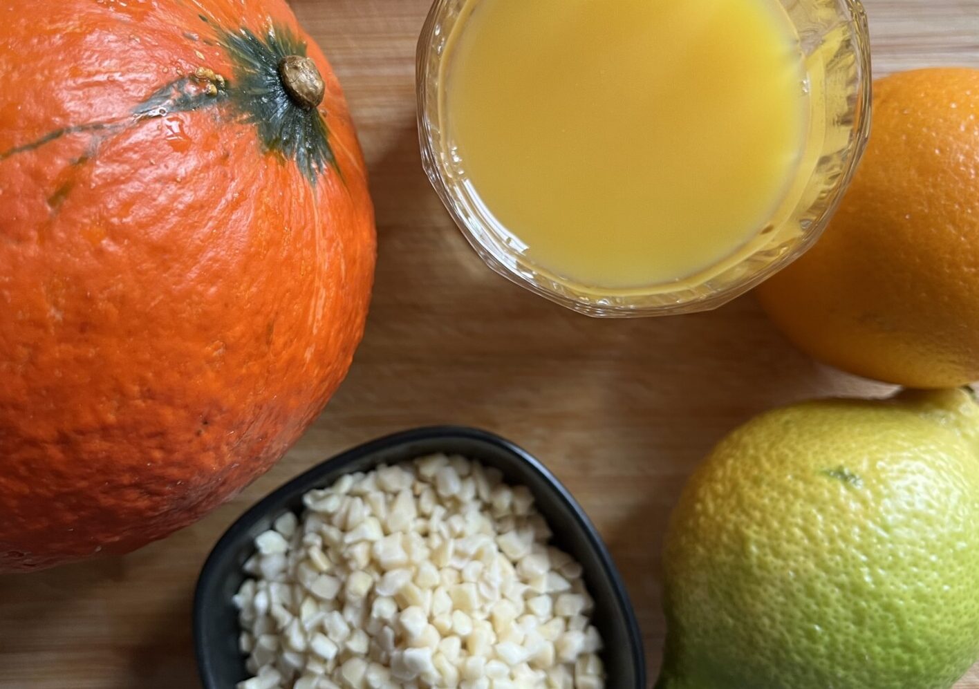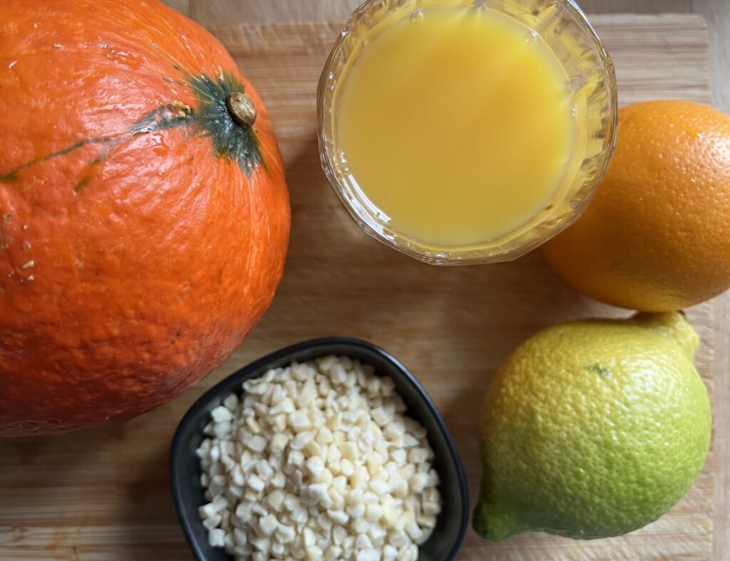 Für 4-5 kleine Gläser benötigt ihr: 750 g vorgegarter Kürbis, 150 ml Orangensaft, 1 Bio-Orange, 1 Biozitrone, 450 g Bio-Gelierzucker 1:2, 60 g gehackte Mandeln, 1/2 TL Zimt.